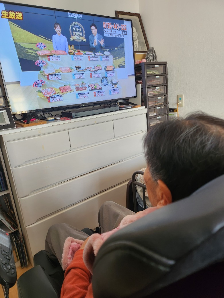 立派なマッサージチェアに座りジャパネットのグルメ特集をご覧になっているT様。